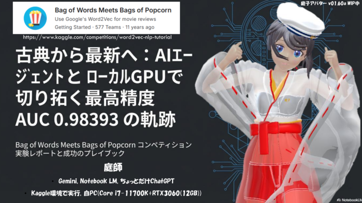 今回は自然言語処理の入門編と言えるコンペ解説です。 GeminiでEDA, コード作成し、Kaggle notebook と自前PC(Core i7-11700K + RTX3060)で実行しました。最後にGeminiでレポート作成させました。そのレポートと自分で記述した経緯メモ(画像込みPowerPointファイル)の両方をNotebook LMへuploadしてスライド作成。最初のパートは自前 […]