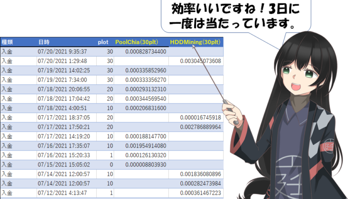 30plotにしてみましたが、HDDMiningPool.jpの方が効率良さそうです。 取得コインが多い方がやはり最後はうれしいですよ。HPOOLも効率よいとの話ありますが、秘密鍵を提出しないと行けないようなので、ここでは様子見にしておきます。 HDDMiningPool.jpは規模で他と見劣りりますし、実際順位はどんどん落ちているのですが、比較的大きな配分が三日に一度やってくるのならば十分かと感 […]
