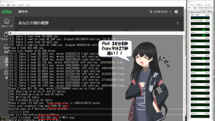 はい、今までと比べると、棒グラフが異次元ですね。chia-plotterすごいです。さらに、24時間フルではないし、いろいろ実験しながらですし、とちゅう片方止まってたりしたので、まだ余力あります。だいたい1時間12分で2並列plotするので、1plotあたり36分、24時間だと40plotくらいしてくれそうです。 8スレッド・シングル47分が、2並列で36分になるというのはコピー時間10分を削減し […]