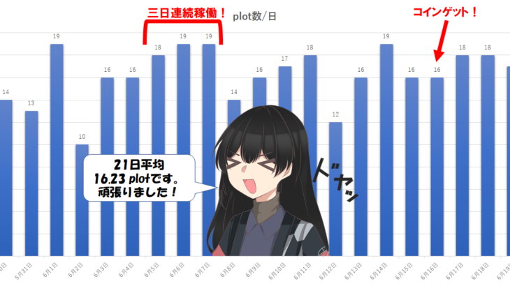 ふーむ、平均14.4plotかな・・・ Farming PCが退院してからの平均plot数。グラフにするとこんな感じ。 そうそう。このグラフは深夜0時から次の日の0時までで区切りました。20plotの時は20時から20時で、都合の良いところで区切った感じですね。18.5plot/日の速度なので19plotが妥当でしょう。この日(6月1日)は幸運にもFarming PCが落ちなかった日ですね。 ログ […]