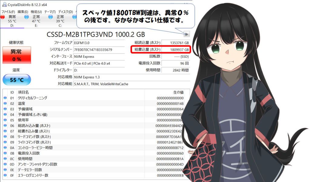 CFD-SSD スペック1800TBW到達は、異常0%到達後!