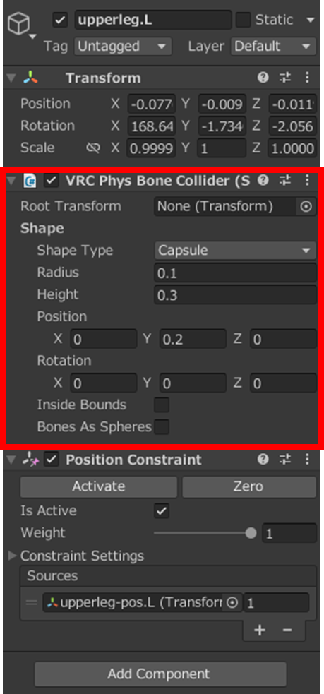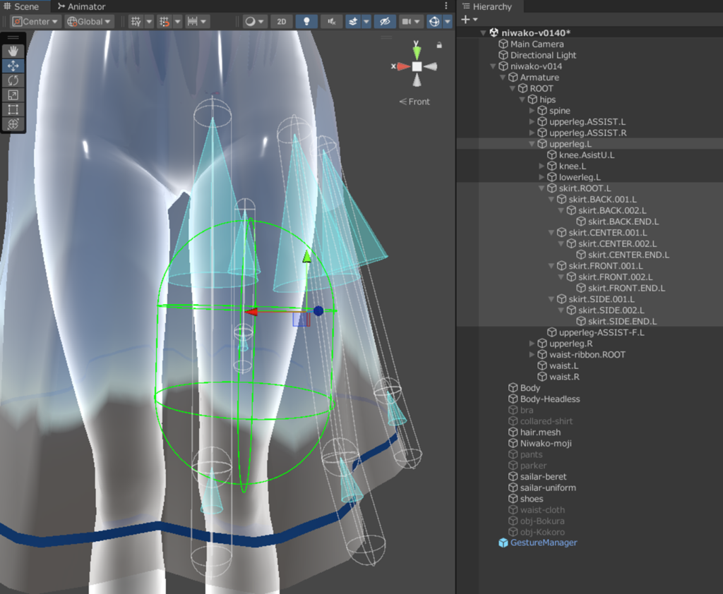 upperleg.L/Rの両方にコライダーを入れ、skirt.ROOT.L/R両方にPhysBone設定します。