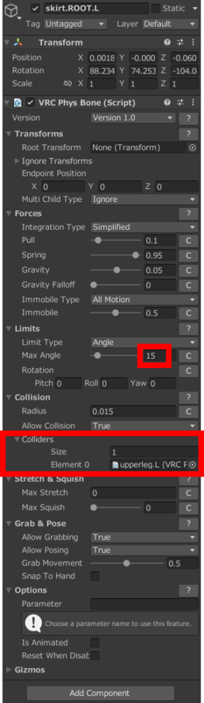 skirt.ROOT.L/RのPhysBone設定は下記。Max Angleを15度と小さめにして突き抜け破綻しないよう制御しやすくしました。コライダーにはupperlegを設定します。