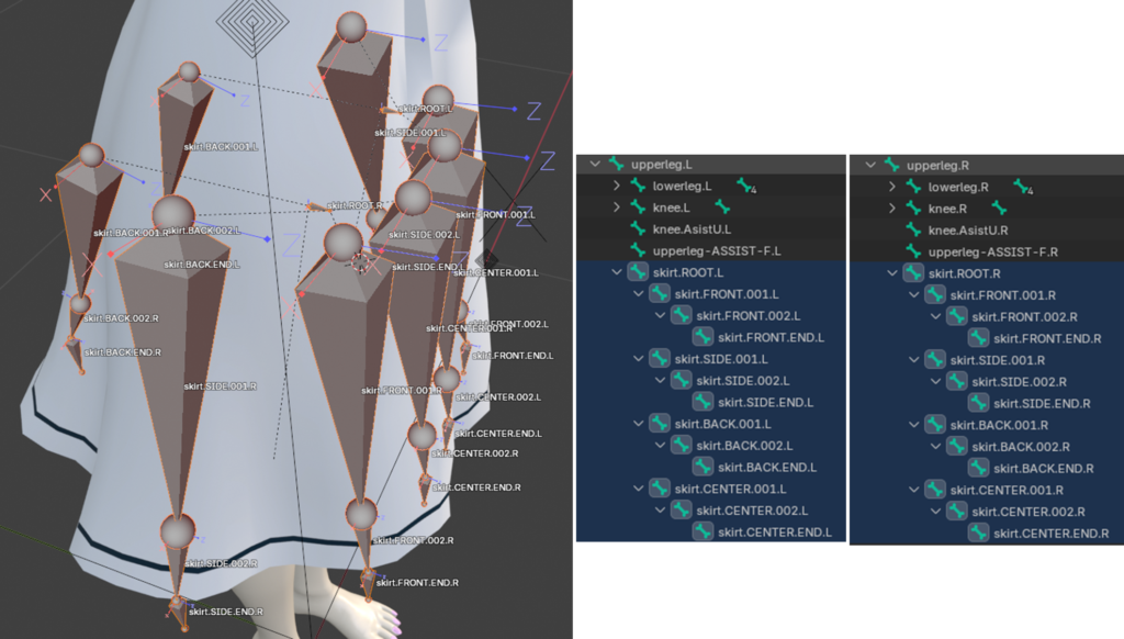 多くのスカートボーンはhipボーンの子ボーンとして構築しているようです。庭子ではキレイにダンスするアバター目指しているので、少し工夫してみました。左右の足は大きく開くこと前提、それにタイトにスカートが追従して欲しい。なのでupperleg.Lにskirt.ROOT.Lを置きスカートボーンの左半分(4組)を、upperleg.Rにskirt.ROOT.Rを置きスカートボーンの右半分(4組)を子ボーンとして設定しました。